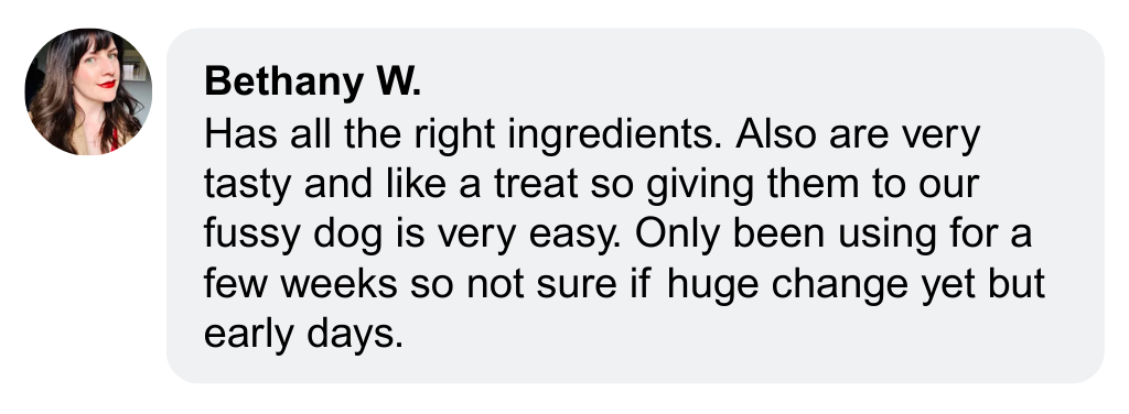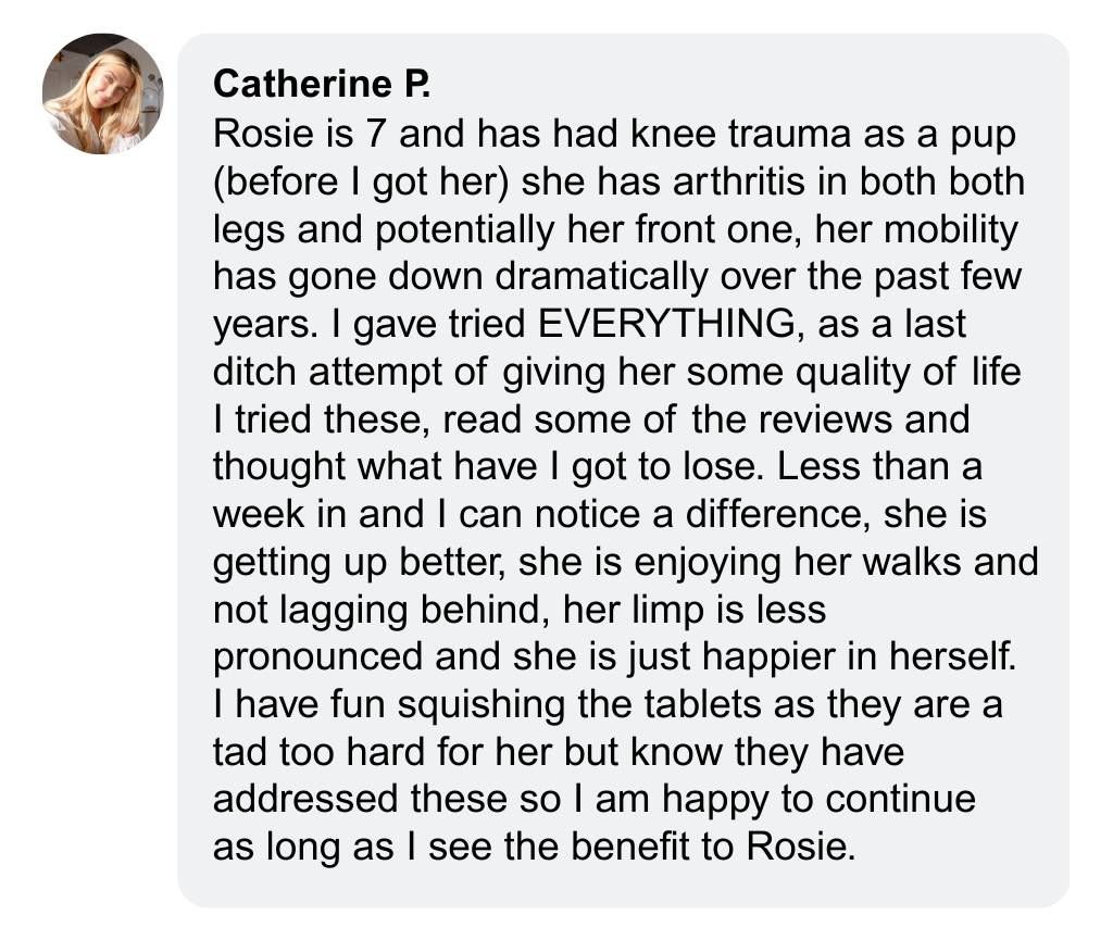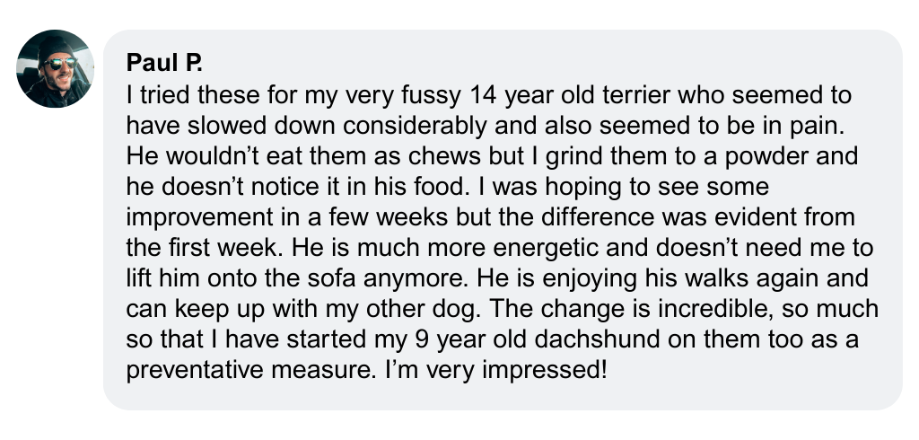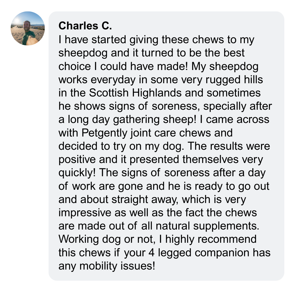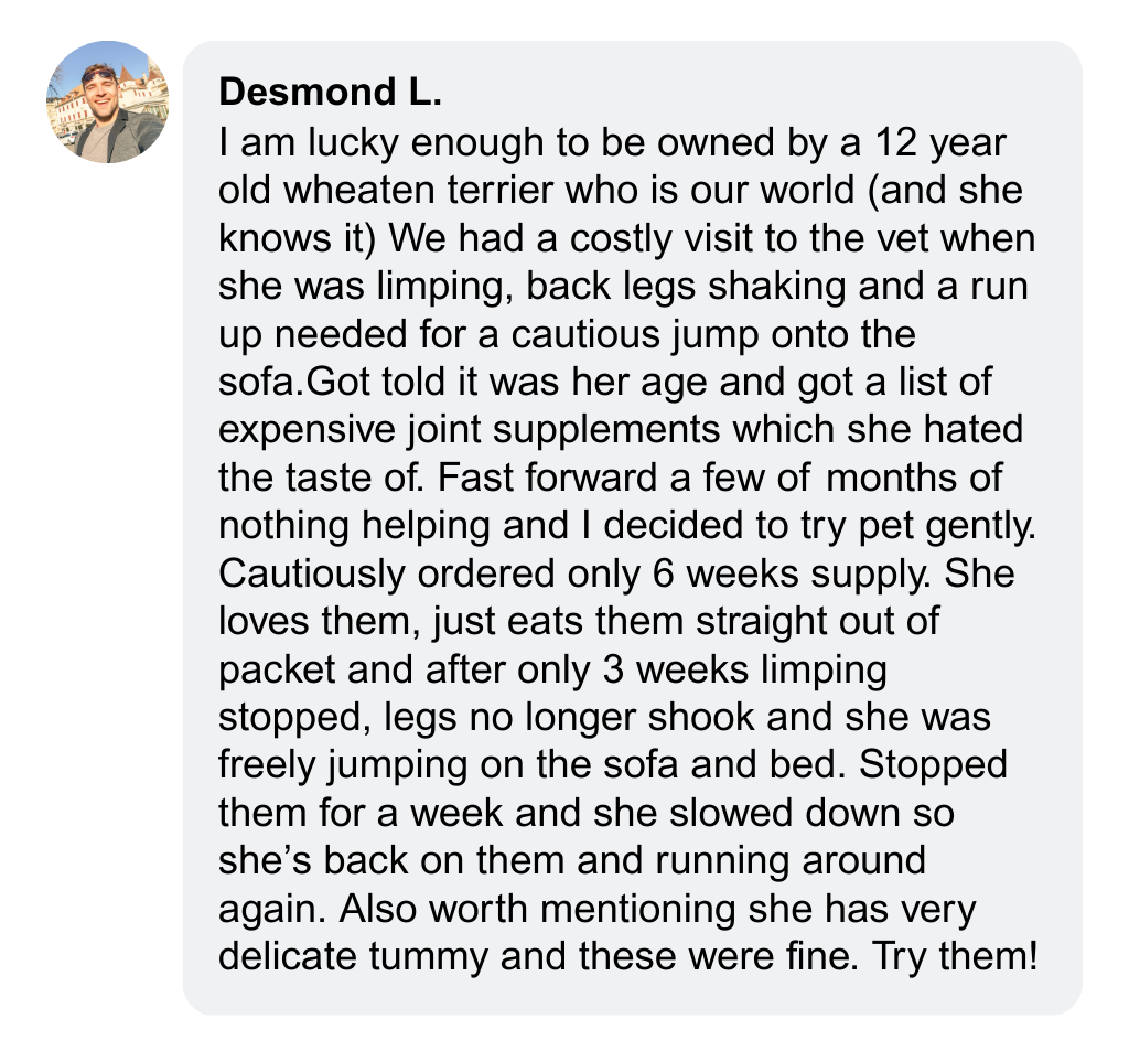 I’m honestly shocked by how effective these joint chews are after just 3 weeks of use! I didn’t think they would actually work but thought i may as well try for my dogs sake. I’ve tried everything for Bella — stem cell treatment (that cost £7000!!), other joint supplements from popular brands, Laser treatment, even hydrotherapy. Nothing ever made a real difference and all cost me a small fortune…until I tried Pet Gently. It took a few weeks but my 9 year old dog Bella is now actually running again when we went on our walk this morning!! She has suffered with joint pain and stiffness for nearly 3 years now and we even considered putting her to sleep :( So thankful I found this product and she finally is moving better again!