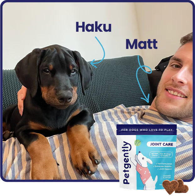 Haku is my 2-year-old Doberman and one day his back leg went stiff — he wouldn’t even put weight on it. I thought it was just a knock, but after a week I took him to the vet. They quoted £500 for a scan yet still couldn’t confirm what was wrong. I didn’t want to rely on expensive meds that just hide the pain and can cause side effects, so I started researching natural options. Most dog supplements had fillers, artificial flavours, or GMOs — and left out the best joint-supporting ingredients. That’s when I decided to make my own formula. Pet Gently was born, and within 4 weeks Haku was running around again like nothing had happened.