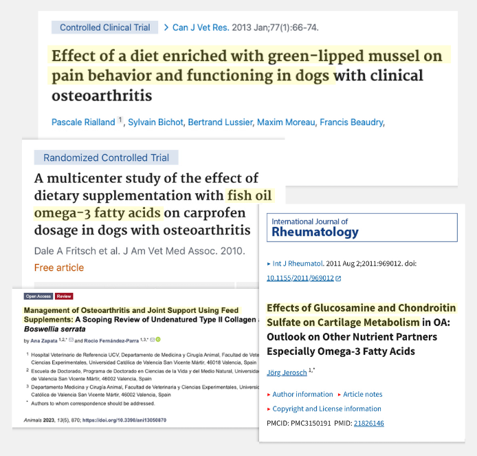 These natural ingredients have been studied for centuries. 1000+ studies explore their properties. Together they support your dog's daily comfort and mobility.